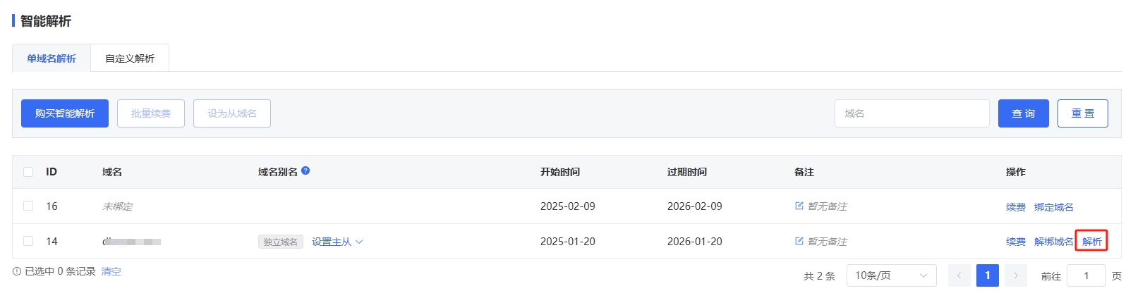 成功绑定域名后,会在操作界面出现解析选项,如下图: