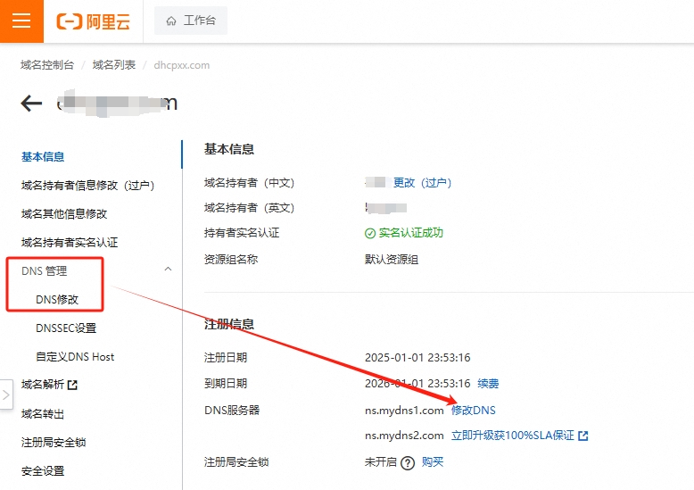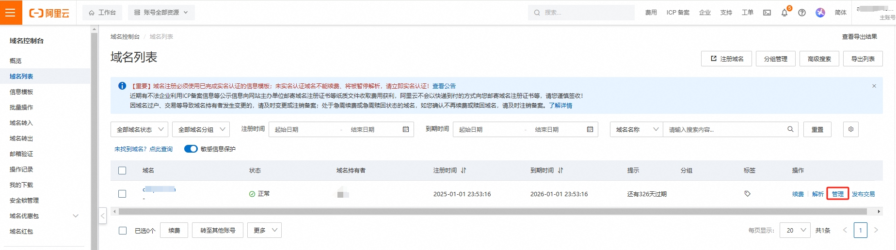 这里以 阿里云 为例,例如您的域名是在 阿里云 注册的,登录 阿里云 的域名控制台后,点击"域名"后的管理,如下图: