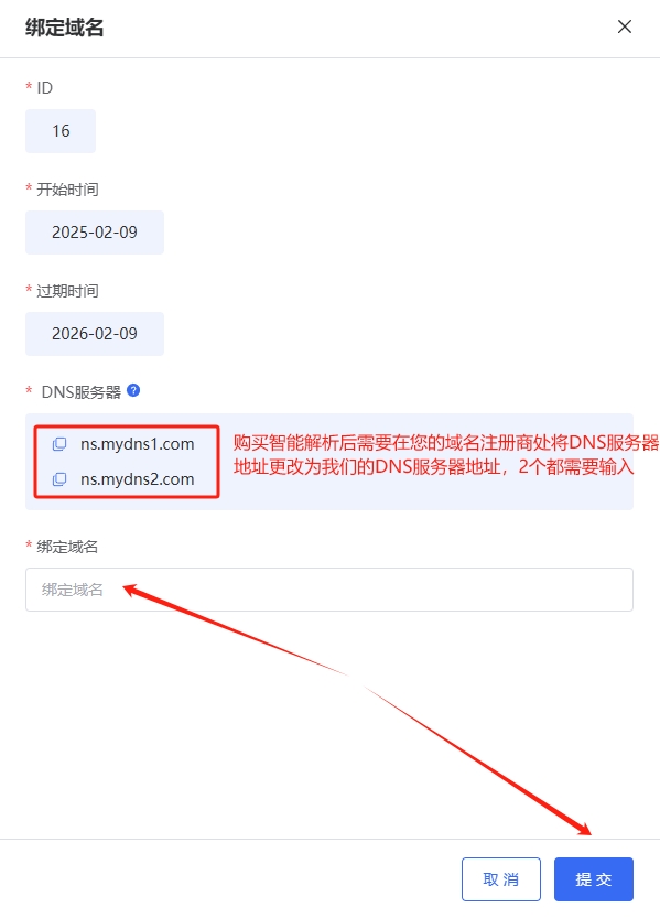 在云解析中,点击“绑定域名”点击后会弹出如下图的设置界面,在绑定域名下方输入您的域名地址并提交,请注意这里您提交后,请前往您的域名注册商处修改 DNS 服务器地址为我们的智能解析套餐对应的 DNS 服务器地址。