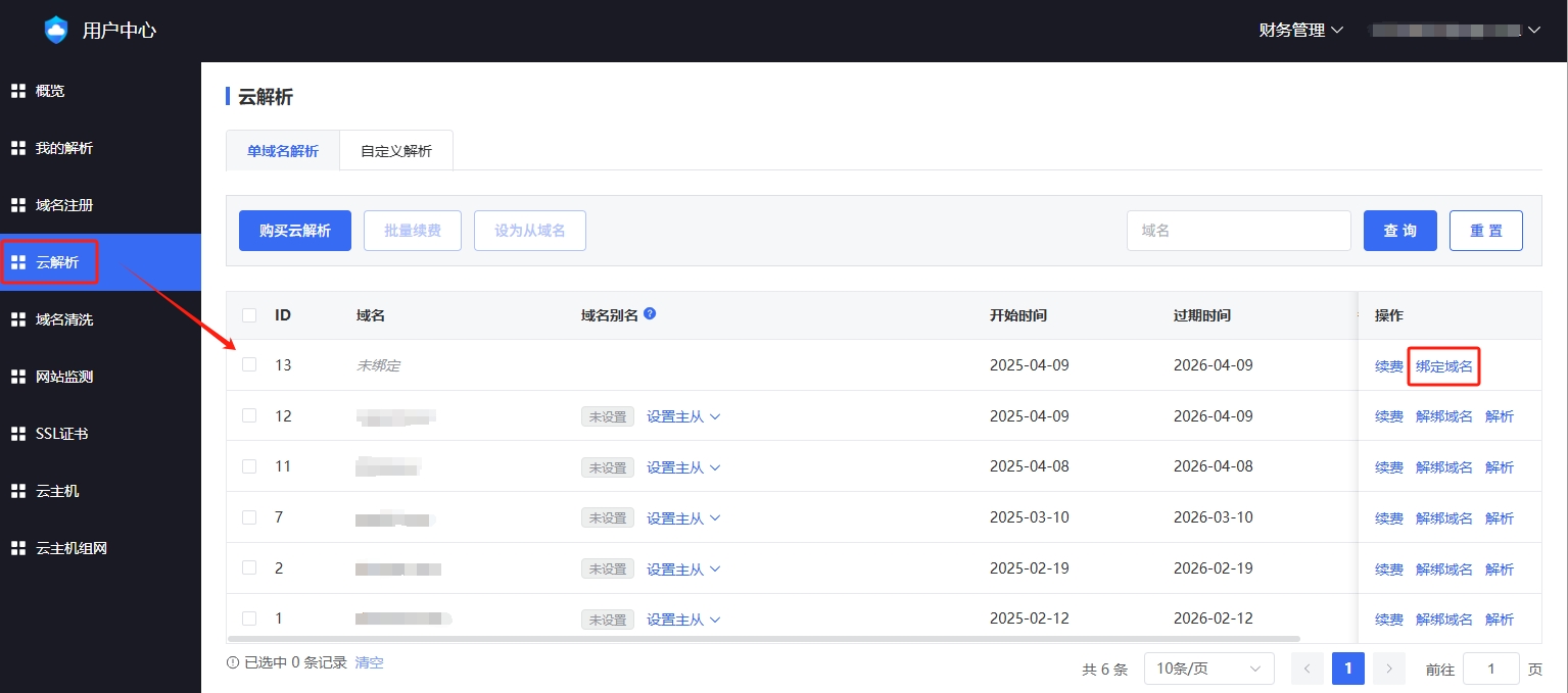 支付成功后,进入用户中心,点击左侧的“云解析”会在右侧显示已购买的云解析服务列表,如下图: